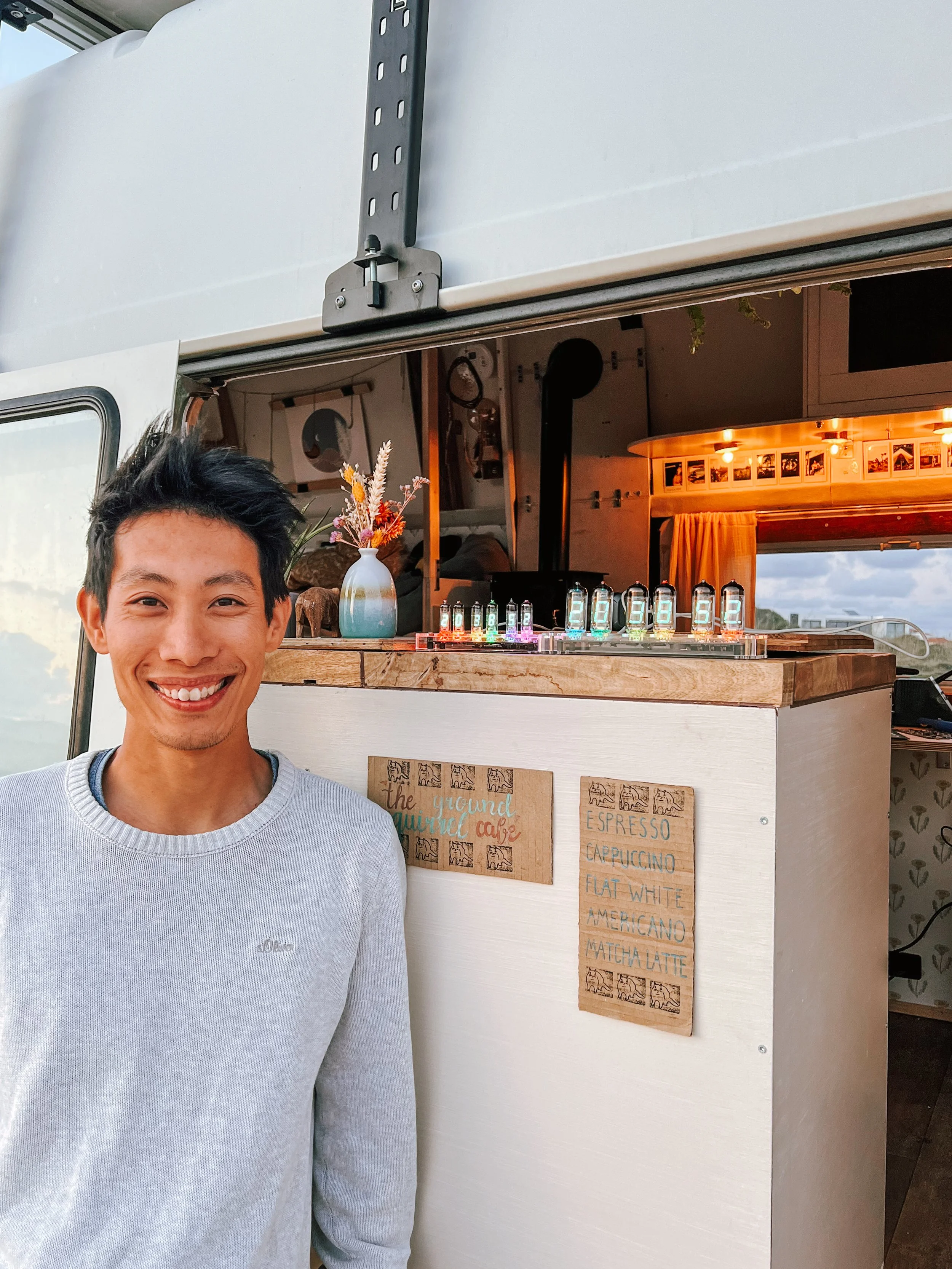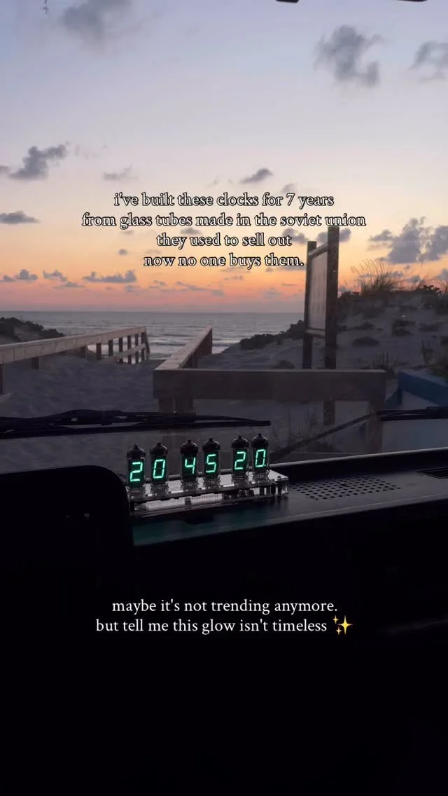 I’m Frank, and I create vintage tube clocks. I design and hand-build them using original Soviet-era IV-11 and IV-6 VFD tubes brought back to life. Every clock is crafted by hand in my self-converted Volkswagen van studio powered by solar energy.